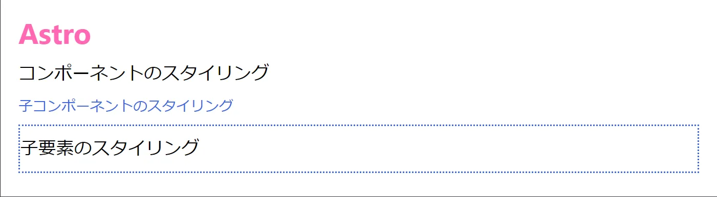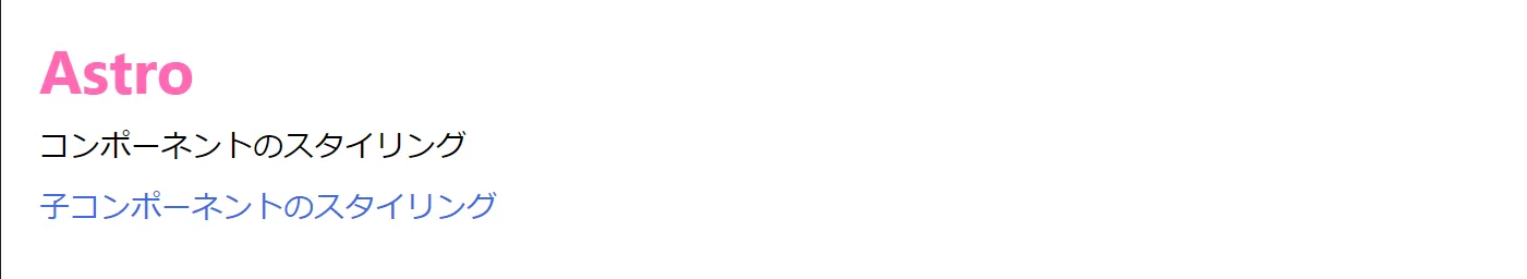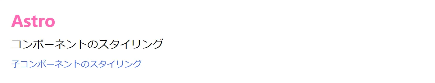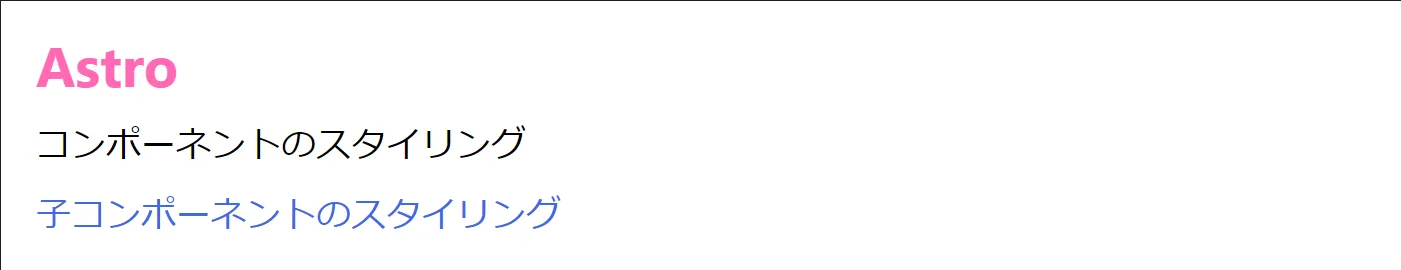 <div> <h1>Astro</h1> <p>コンポーネントのスタイリング</p> <Child /></div>