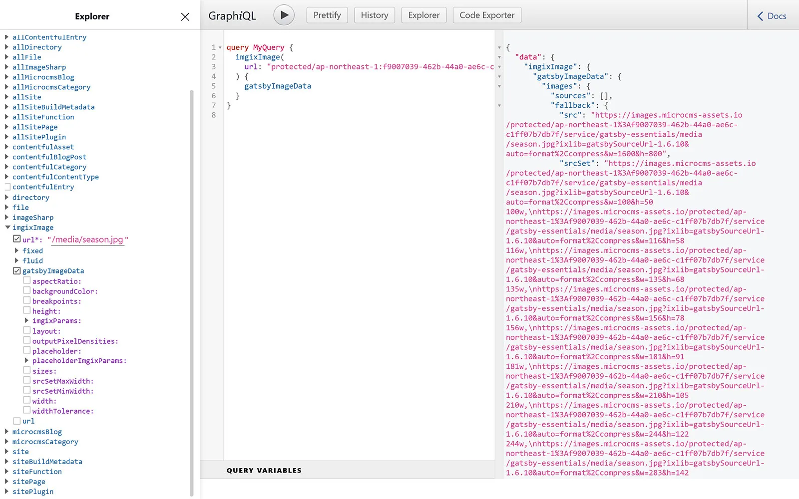 query MyQuery { imgixImage( url: "protected/xxxxxxx/media/season.jpg" ) { gatsbyImageData }}これで、gatsbyImageData互換のデータが取得できます。