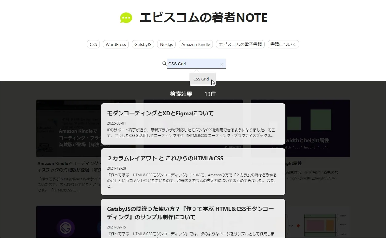 新しい本が出るということで、サイトの方も色々とテコ入れしているのですが、Jamstack構成のサイトで悩ましいことになるのが検索機能と関連記事の表示ではないでしょうか。