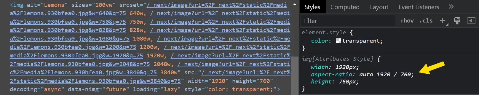 <span style=" box-sizing: border-box; display: block; overflow: hidden; width: initial; height: initial; background: none; opacity: 1; border: 0; margin: 0; padding: 0; position: relative; " ><span style=" box-sizing: border-box; display: block; width: initial; height: initial; background: none; opacity: 1; border: 0; margin: 0; padding: 0; padding-top: 75%; " ></span ><img alt="Lemons" src="/_next/image?url=%2F_next%2Fstatic%2Fmedia%2Flemons.e2b3a5a8.jpg&w=3840&q=75" decoding="async" data-nimg="responsive" style=" position: absolute; inset: 0px; box-sizing: border-box; padding: 0px; border: none; margin: auto; display: block; width: 0px; height: 0px; min-width: 100%; max-width: 100%; min-height: 100%; max-height: 100%; " sizes="100vw" srcset=" /_next/image?url=%2F_next%2Fstatic%2Fmedia%2Flemons.e2b3a5a8.jpg&w=640&q=75 640w, /_next/image?url=%2F_next%2Fstatic%2Fmedia%2Flemons.e2b3a5a8.jpg&w=750&q=75 750w, /_next/image?url=%2F_next%2Fstatic%2Fmedia%2Flemons.e2b3a5a8.jpg&w=828&q=75 828w, /_next/image?url=%2F_next%2Fstatic%2Fmedia%2Flemons.e2b3a5a8.jpg&w=1080&q=75 1080w, /_next/image?url=%2F_next%2Fstatic%2Fmedia%2Flemons.e2b3a5a8.jpg&w=1200&q=75 1200w, /_next/image?url=%2F_next%2Fstatic%2Fmedia%2Flemons.e2b3a5a8.jpg&w=1920&q=75 1920w, /_next/image?url=%2F_next%2Fstatic%2Fmedia%2Flemons.e2b3a5a8.jpg&w=2048&q=75 2048w, /_next/image?url=%2F_next%2Fstatic%2Fmedia%2Flemons.e2b3a5a8.jpg&w=3840&q=75 3840w " /><noscript ><img alt="Lemons" sizes="100vw" srcset=" /_next/image?url=%2F_next%2Fstatic%2Fmedia%2Flemons.e2b3a5a8.jpg&w=640&q=75 640w, /_next/image?url=%2F_next%2Fstatic%2Fmedia%2Flemons.e2b3a5a8.jpg&w=750&q=75 750w, /_next/image?url=%2F_next%2Fstatic%2Fmedia%2Flemons.e2b3a5a8.jpg&w=828&q=75 828w, /_next/image?url=%2F_next%2Fstatic%2Fmedia%2Flemons.e2b3a5a8.jpg&w=1080&q=75 1080w, /_next/image?url=%2F_next%2Fstatic%2Fmedia%2Flemons.e2b3a5a8.jpg&w=1200&q=75 1200w, /_next/image?url=%2F_next%2Fstatic%2Fmedia%2Flemons.e2b3a5a8.jpg&w=1920&q=75 1920w, /_next/image?url=%2F_next%2Fstatic%2Fmedia%2Flemons.e2b3a5a8.jpg&w=2048&q=75 2048w, /_next/image?url=%2F_next%2Fstatic%2Fmedia%2Flemons.e2b3a5a8.jpg&w=3840&q=75 3840w " src="/_next/image?url=%2F_next%2Fstatic%2Fmedia%2Flemons.e2b3a5a8.jpg&w=3840&q=75" decoding="async" data-nimg="responsive" style=" position: absolute; top: 0; left: 0; bottom: 0; right: 0; box-sizing: border-box; padding: 0; border: none; margin: auto; display: block; width: 0; height: 0; min-width: 100%; max-width: 100%; min-height: 100%; max-height: 100%; " loading="lazy" /></noscript></span>基本的な構成は、Gatsby Imageと同様です。<span>でラップしているのも、CLS対策でパディングを利用するためのものです。プレースホルダの処理も行われますが、このコードの中にはありません。